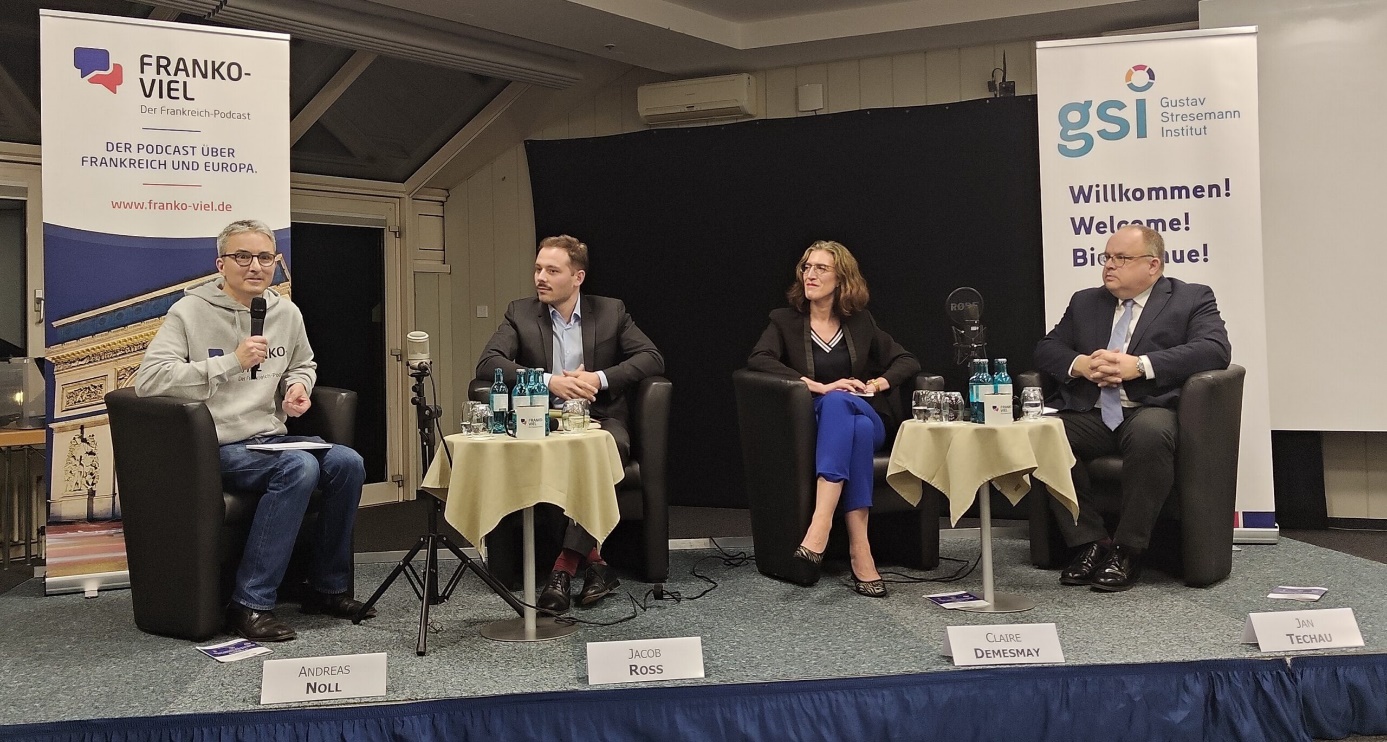 Jetzt, zur 100. Folge des Podcasts „FrankoViel“, hatten die „Macher“ zu einem „LivePodcast“ in das Gustav-Stresemann-Institut in Bonn eingeladen, bei dem drei Experten über die „Melodie einer schwierigen Partnerschaft“ diskutierten, das Konzept eines „Françallemagne“ (also einer Union Frankreichs und Deutschlands) als Option für Europa. Die Veranstaltung, zu der auch einige Mitglieder unserer DFG erschienen waren, war gut besucht. Es wird nicht überraschen, dass nicht vorrangig über die Einzelheiten einer solchen Union diskutiert wurde, die niemandem realistisch erscheint, sondern darüber, vor welchen Herausforderungen beide Länder zur Zeit stehen, und wie, bzw. ob sie diese gemeinsam bewältigen können. Es besprachen (von links nach rechts) Andreas Noll, Dr. Jacob Ross, Leiter des Frankreich-Programms der DGAP in Berlin. Dr. Claire Demesmay, seit vergangenem Herbst Leiterin des Institut Français in Bonn und Jan Techau, Europa-Direktor der (USamerikanischen) Eurasia Group, ebenfalls aus Berlin, die vielen verpassten Gelegenheiten, die Neuanfänge und darauf folgenden Enttäuschungen (Macron-Merkel und Sorbonne, MacronScholz und Ukraine/Biden, Macron-Merz und Finanzen/FCAS, Macron ohne Mehrheit), die Lehren, die hätten gezogen werden können und müssen, die aber nicht gezogen wurden. Dabei spielte natürlich auch die trotz ähnlicher Ausdrucksweise immer wieder recht unterschiedliche Bewertung der Rolle der USA und Donald Trumps in und für Europa eine große Rolle.